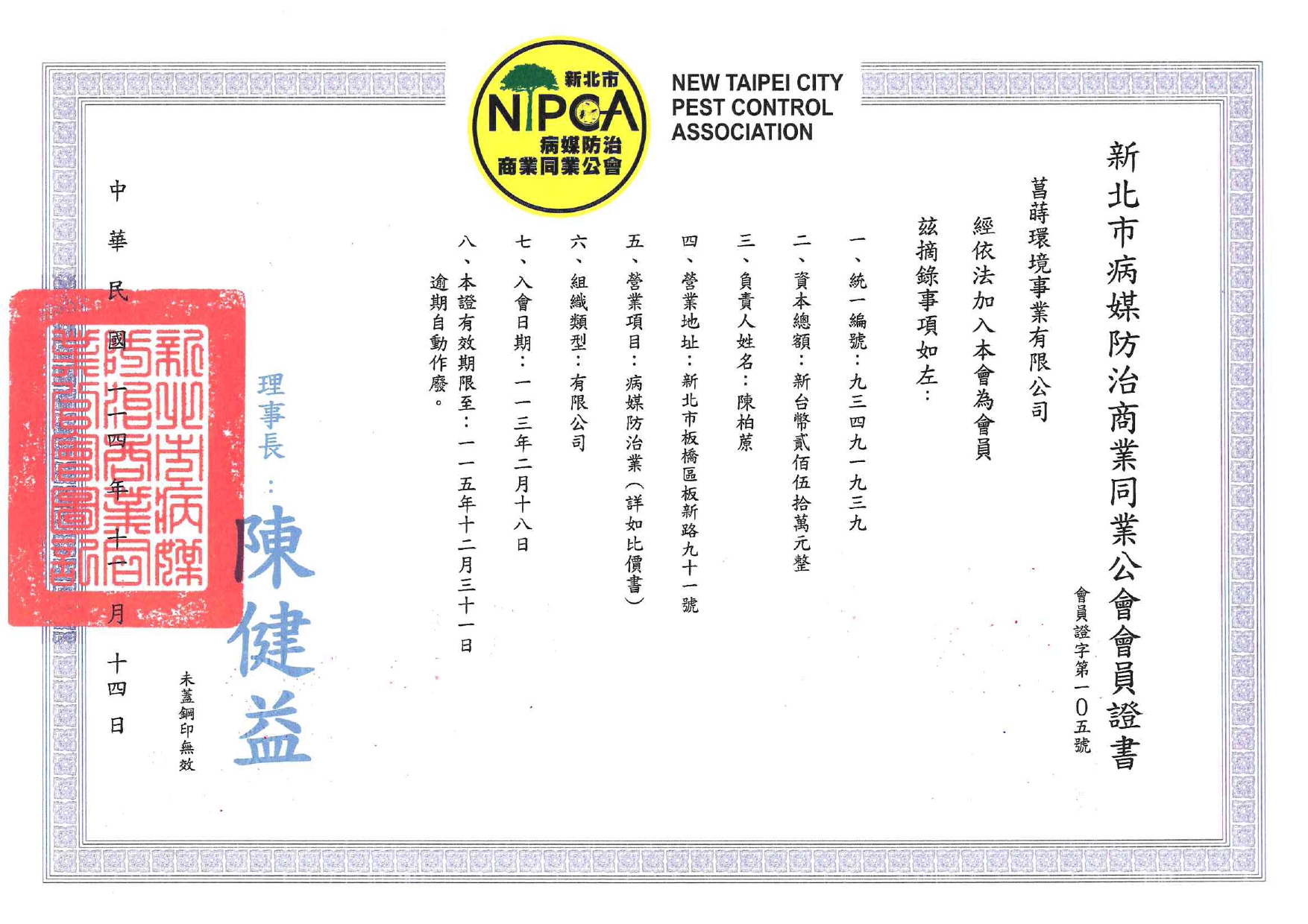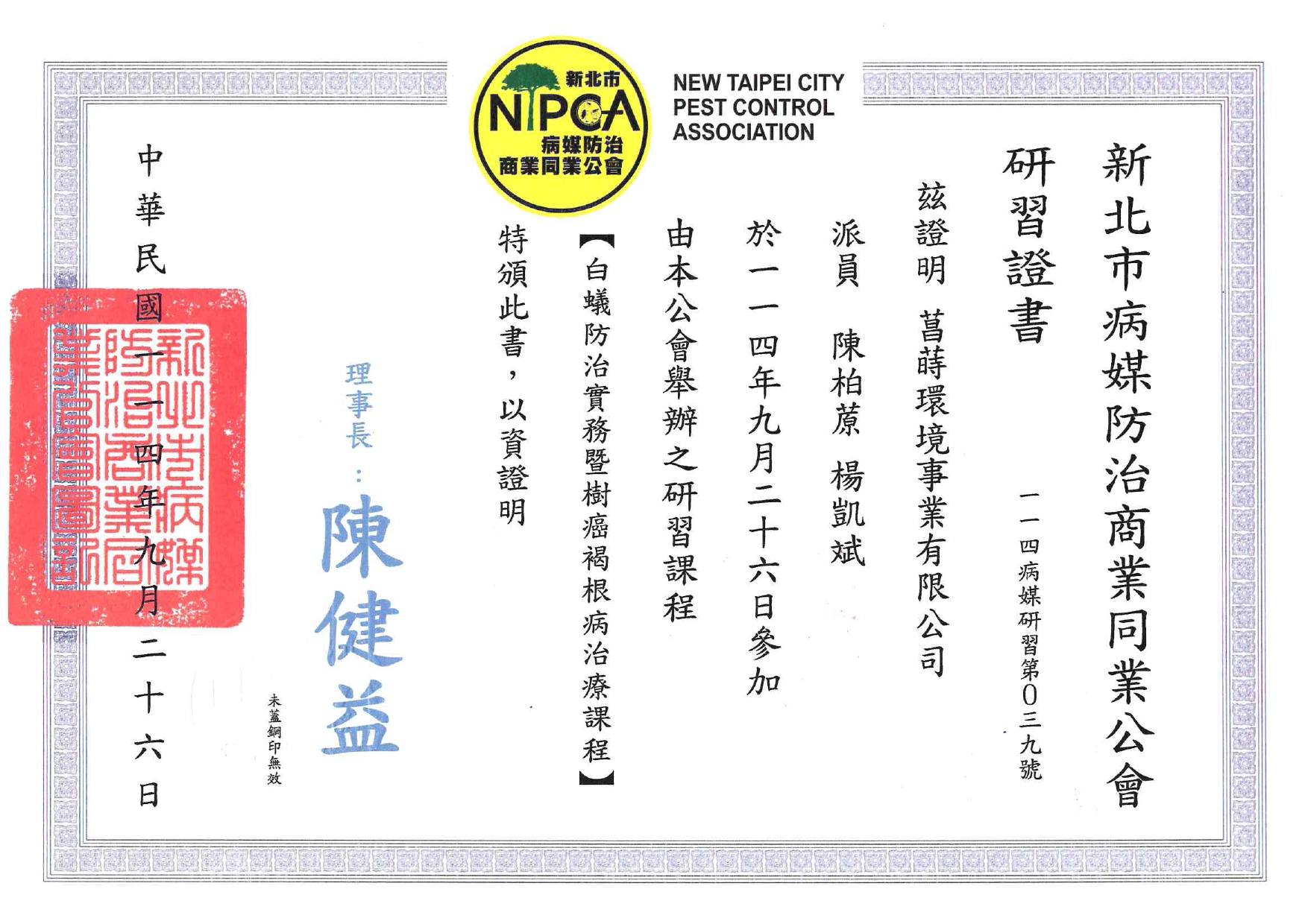 關於菖蒔 經營理念 菖蒲為天中五瑞之首,象徵驅除不祥的寶劍。蒔則有種植、分種之意。 自古以來,華人文化將菖蒲飾於門上,亦或用來清洗身體盼能避邪驅瘟、逢凶化吉。 取菖蒔為公司名,並將商標設計為將菖蒲種植於屋內,意即替所有尊貴的客戶去除環境中不好的事物。 我們將秉持著這個理念,提供病媒防治、除醛淨化、造園景觀等環境相關業務,以最真誠的態度聆聽您的需求、以最專業的知識替您優化生活環境。 專業證書